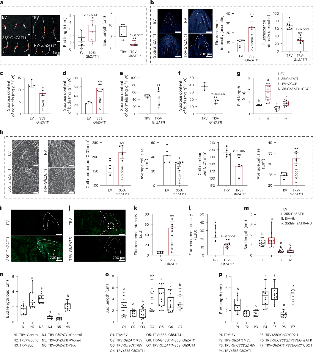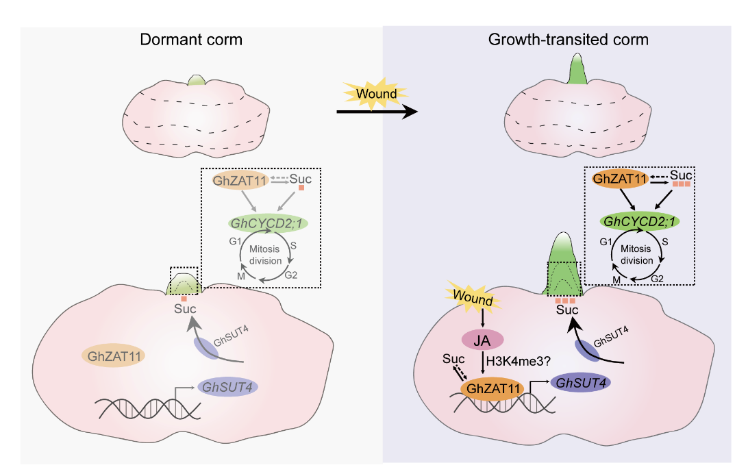 通过进一步的分子生物学、细胞生物学和遗传学等实验,该研究发现,损伤/JA信号通过激活转录因子GhZAT11发挥作用。在感知损伤或JA信号后,GhZAT11被迅速诱导表达,直接结合并激活下游两个关键基因表达:蔗糖转运蛋白GhSUT4和细胞周期基因GhCYCD2;1。GhSUT4促进蔗糖通过质外体途径从球茎快速转运至芽的顶端分生组织。GhCYCD2;1驱动芽内细胞周期从G1期进入S期,从而激活芽中细胞的快速分裂。