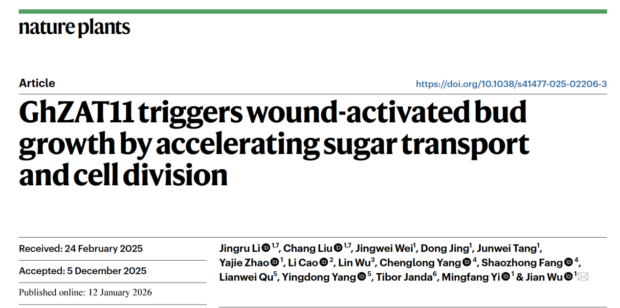 近日,中国农业大学吴健教授团队在植物科学领域国际顶尖期刊 Nature Plants 在线发表研究论文GhZAT11 triggers wound-activated bud growth by accelerating sugar transport and cell division,系统揭示了转录因子GhZAT11作为损伤信号与茉莉酸(JA)的核心应答枢纽,通过协调糖转运与细胞分裂通路,驱动球根作物芽“休眠—生长”生理转变(Bud-growth transition, BGT)的分子机制。这项研究为精准调控园艺球根作物的休眠期、延长采后贮藏寿命提供了全新的理论“靶点”。