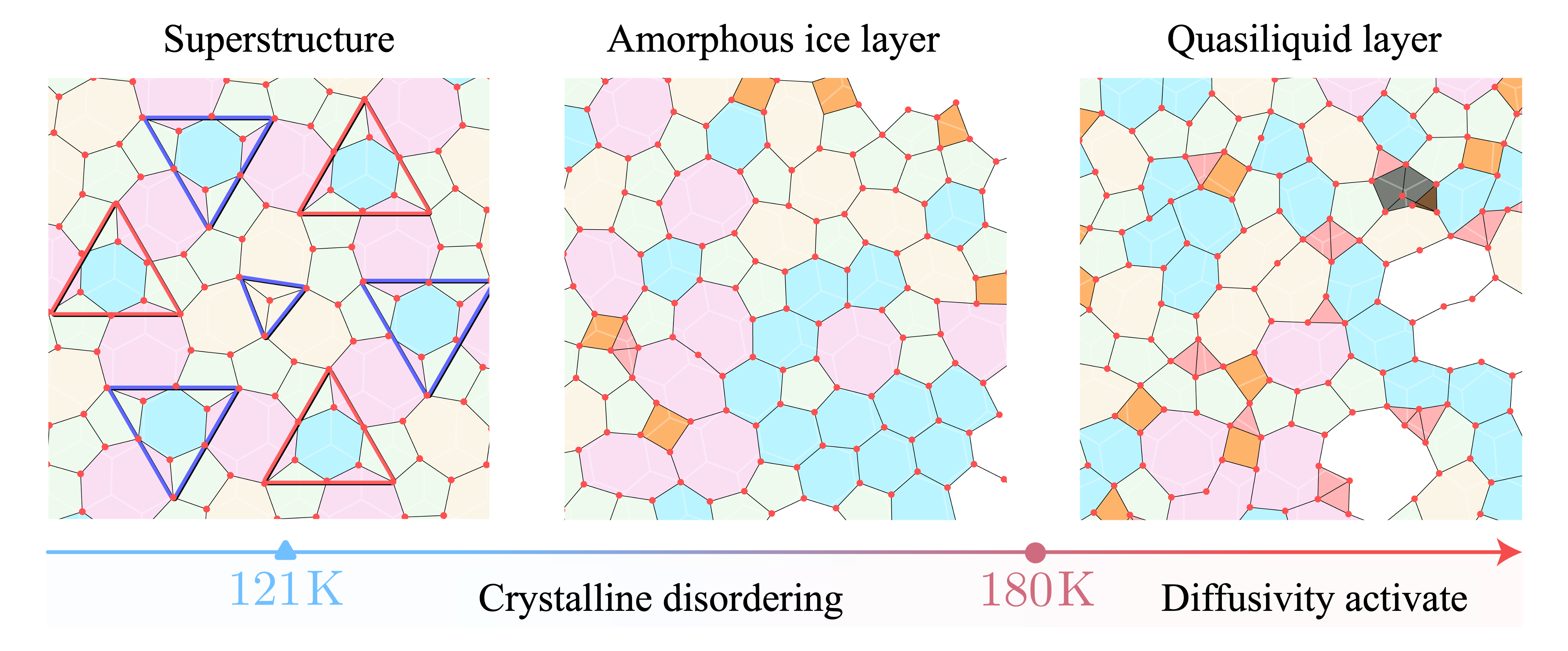 基于这一框架的重构与分子动力学模拟,团队发现了冰表面在121K至180K之间的无定形冰层。该层形成于121K至180K之间,有高度拓扑无序但依然保持固态的动力学特征,随后随温度升高逐渐转化为准液体层(图二)。