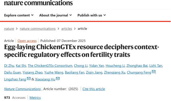 12月7日,中国农业大学、丹麦奥胡斯大学以及南京农业大学等单位的研究人员在Nature Communications期刊发表研究论文《产蛋阶段GTEx资源解析鸡繁殖性状特异性调控机制及功能基因》(Egg-laying ChickenGTEx resource deciphers context-specific regulatory effects on fertility traits)。研究团队构建了覆盖下丘脑–垂体–卵巢轴与肝脏的产蛋阶段特异性GTEx(Genotype-Tissue Expression)资源,并系统刻画不同产蛋阶段的调控效应。
