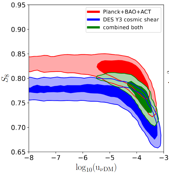 为验证该理论,研究团队对不同尺度和时期的宇宙学数据,分别开展了独立与联合分析。研究发现,反映早期宇宙的阿塔卡马宇宙学望远镜高精度数据,以及反映晚期宇宙的暗能量巡天弱引力透镜数据,均独立显示出暗物质—中微子的相互作用强度趋向“非零”。联合所有数据分析发现,暗物质—中微子相互作用的统计显著性提升至约3σ,强度约为10−4。这一相互作用强度可使早期与晚期宇宙的结构生长参数S8趋于一致。