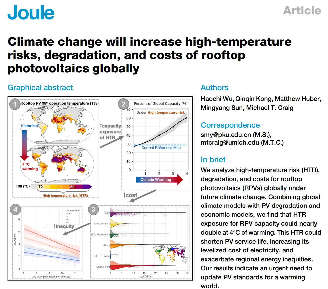 近日,北京大学先进制造与机器人学院孙铭阳研究员团队在能源领域顶级期刊《焦耳》(Joule)上发表题目为《气候变化将加剧全球屋顶光伏发电系统的高温风险、性能退化和成本上升》(“Climate change will increase high-temperature risks, degradation, and costs of rooftop photovoltaics globally”)的研究长文 。
