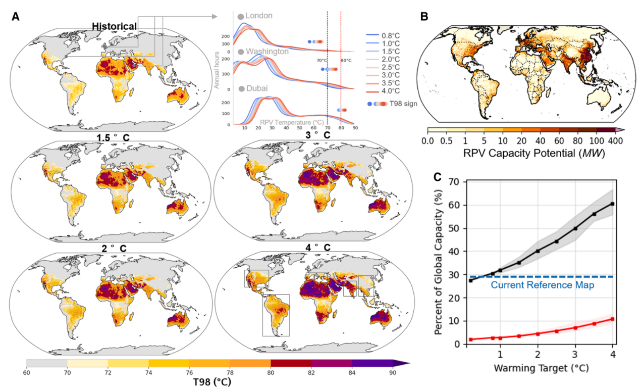 图1:气候变化下全球屋顶光伏面临的高温风险加剧。图示展示了随着变暖程度增加,更多的高纬度地区和人口密集区将进入高温风险区,且现有的IEC标准未能覆盖未来的风险区域