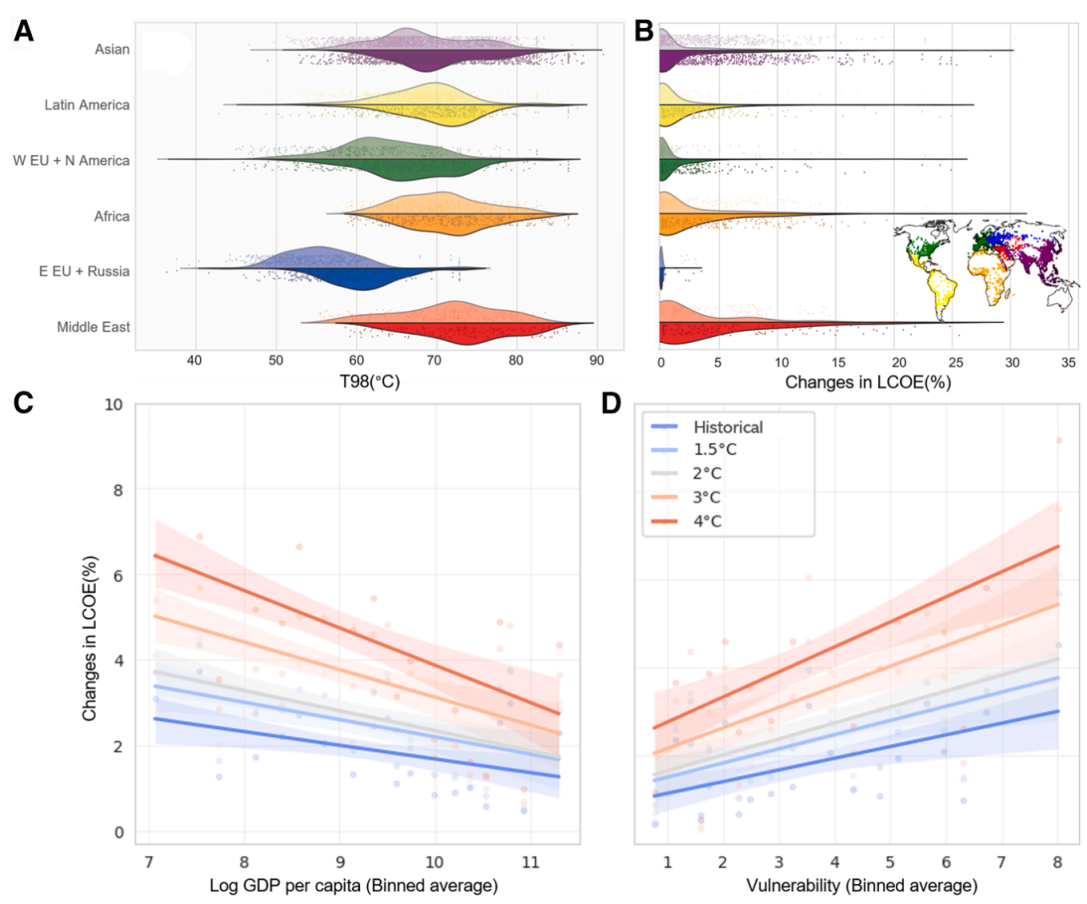 图2. 高温风险与LCOE增长的区域差异。低GDP地区和气候脆弱地区面临更大幅度的成本上升,加剧了能源转型中的区域不平等