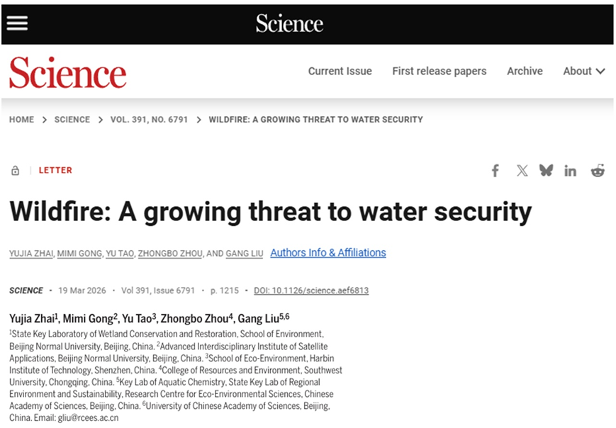 近日,北京师范大学环境学院副教授翟羽佳在《科学》(Science)发表了题为“Wildfire: A growing threat to water security”的观点。野火的影响早已不再局限于陆地与空气。它会沿着河流、含水层、饮用水管网和污水处理系统持续传导,引发一系列级联性风险,进而改变水资源的可获得性与水质安全。长期以来,水资源管理体系存在一个巨大盲区——水务管理者们往往错误地认为,野火影响仅仅是局限在“陆地和空气”中的灾害。科学家与政策制定者必须打破这种割裂的认知,携手重塑水治理体系,将野火作为系统性的水安全威胁来统筹应对。
