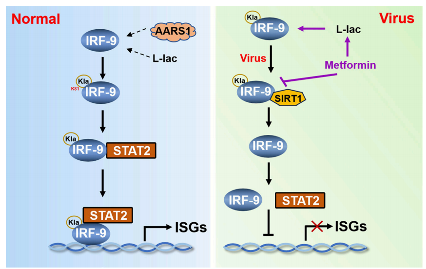 此外,研究还揭示,L-乳酸在病毒感染中具有双重效应:在生理浓度及适度升高水平下发挥抗病毒作用,而在高水平时则可能促进病毒感染。此外,病毒可通过促进SIRT1介导的IRF9去乳酸化削弱宿主免疫应答。研究同时证实,二甲双胍可通过促进乳酸积累并干扰IRF9–SIRT1相互作用,增强IRF9的L-乳酸化水平。
