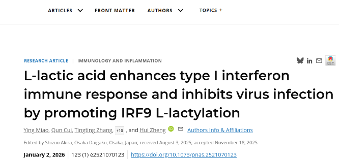 电子科技大学医学院郑慧教授团队在《美国科学院院刊》发表重要研究成果 揭示乳酸调控抗病毒免疫新机制