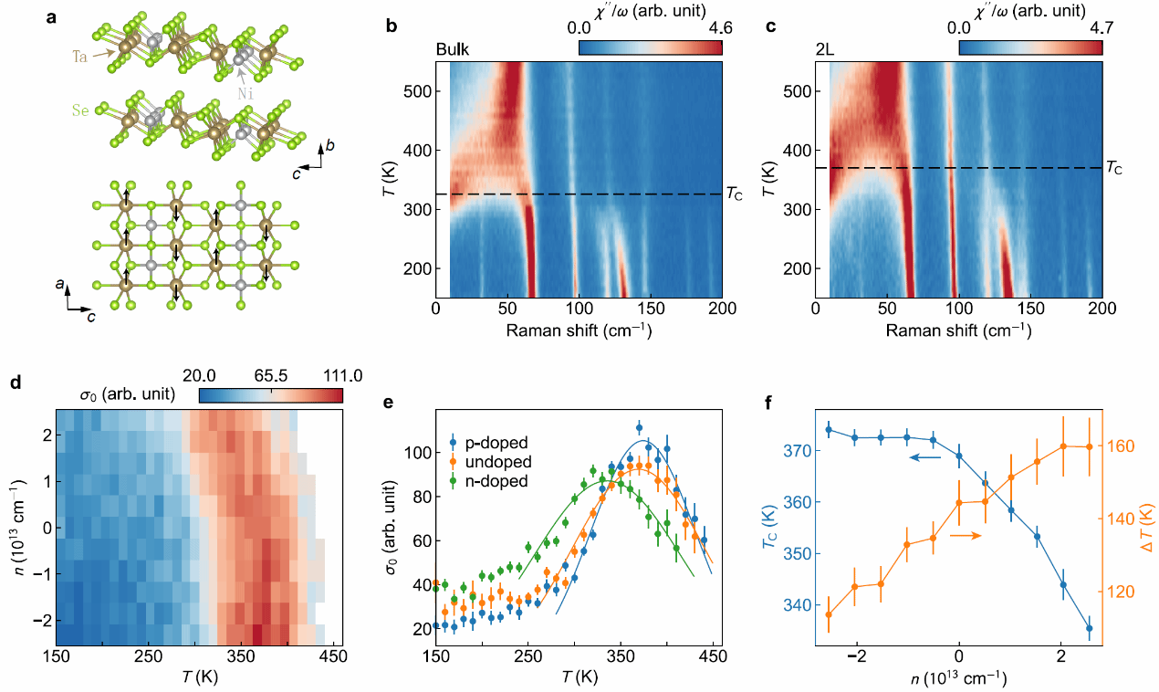 图1.(a)Ta2NiSe5晶体结构与晶格畸变示意图。(b, c)块体与双层样品的温度依赖拉曼响应。(d)双层器件中准弹性散射谱权重的温度与掺杂浓度依赖。(e)典型掺杂下的准弹性散射谱权重温度依赖。(f)相变温度与涨落展宽的掺杂依赖。