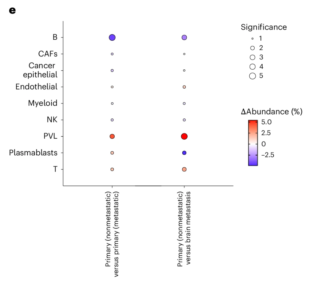 在乳腺癌多组学队列数据分析中,DECODE揭示了肿瘤进展过程中免疫细胞组成的重要变化。例如,在非转移性癌前病变中,T细胞比例显著升高,而B细胞比例明显降低,这一发现与既往研究中“T细胞浸润与良好预后密切相关”的结论一致。进一步的亚群分析表明,CD4⁺T细胞、CD8⁺T细胞以及增殖型T细胞在早期病变阶段均呈增加趋势,而晚期肿瘤中B细胞的增加主要来源于naive B细胞,这可能反映肿瘤免疫功能受损与转移潜能增强。