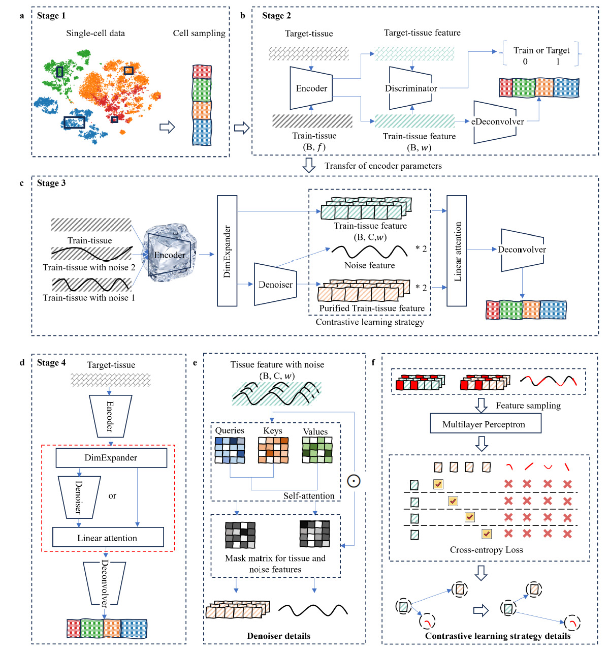 研究团队构建了由多个核心模块组成的统一框架。首先,通过模拟数据生成模块构建训练数据;随后利用迁移对抗学习(transfer adversarial training)对不同组学数据进行特征对齐,从而有效消除跨平台、跨疾病状态和跨数据集之间的批次效应;进一步结合对比学习与自注意力机制对组织样本中的噪声信号进行校正和去除,实现对真实细胞特征的重建。上述模块协同作用,使DECODE在复杂数据环境下仍能稳定恢复细胞类型和细胞状态信息。