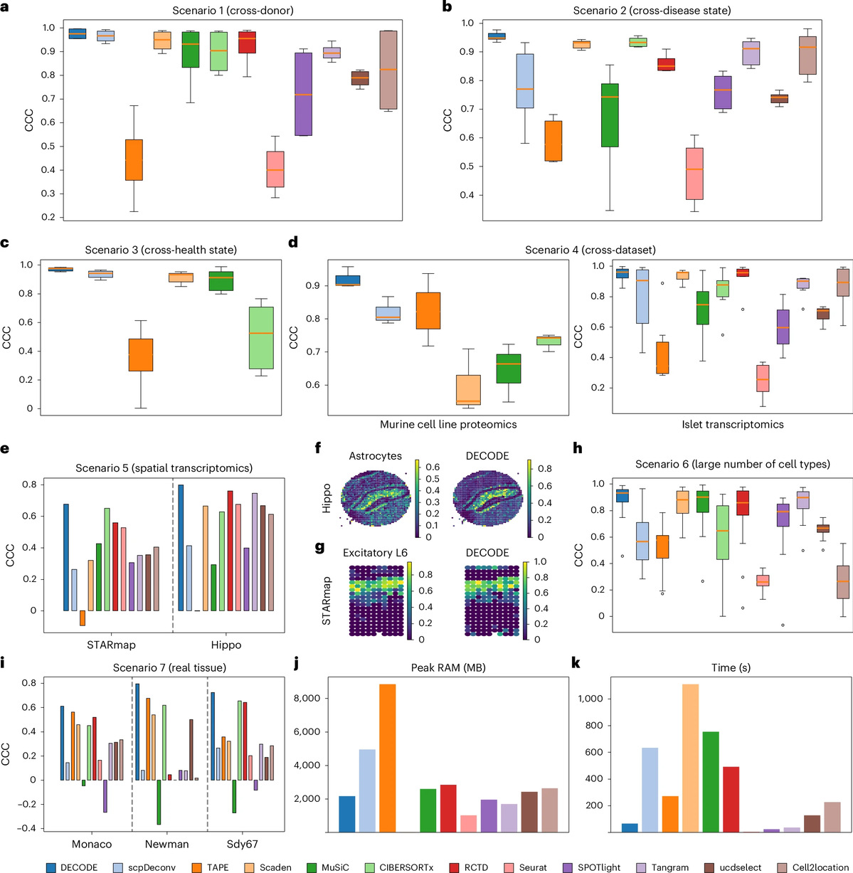 系统评估结果表明,DECODE在不同的组学类型、疾病状态、数据集以及测量平台下均显著优于当前主流算法,并在参考单细胞数据不完整的情况下依然能够准确解析细胞组成,表现出极高的泛化能力和鲁棒性。