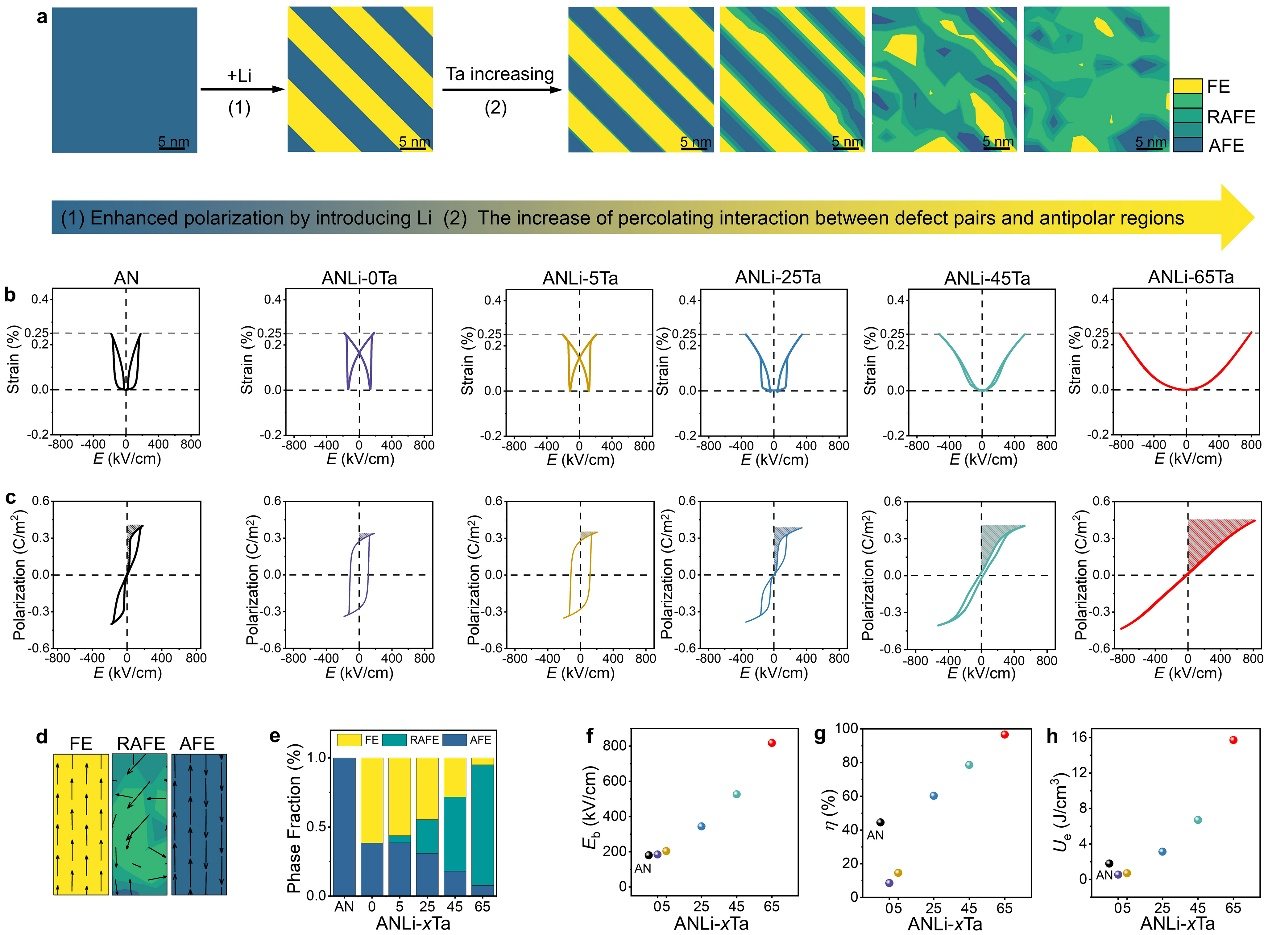 图1 倾转反铁电态畴结构及性能预测的相场计算。a) 通过增强缺陷对与反极区之间的渗透相互作用设计倾转反铁电态,并展示其中铁电(FE)、倾转反铁电(RAFE)、反铁电(AFE)分布的演变过程。b-c) 计算的应变-电场(S-E)和极化-电场(P-E)回线。d) FE、RAFE和AFE中极化矢量的典型特征图。e)不同ANLi-xTa和AN相分数演变。f-h) ANLi-xTa体系随Ta含量增加的击穿强度(Eb)、储能效率(η)和可恢复储能密度(Ue)变化。