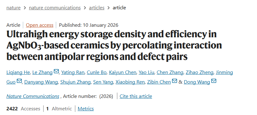 近日,西安交通大学前沿科学技术研究院王栋教授团队在无铅反铁电储能材料领域取得重要进展,相关成果以《缺陷对-反极性区渗透实现AgNbO3陶瓷材料超高储能密度与效率》(Ultrahigh energy storage density and efficiency in AgNbO3-based ceramics by percolating interaction between antipolar regions and defect pairs)为题发表于国际知名期刊《自然·通讯》(Nature Communications)。该研究通过多尺度理论计算指导实验设计的方法,成功制备出兼具超高储能密度、高效率和优异热稳定性的AgNbO3基陶瓷材料。该材料在室温下可实现12.8 J/cm3的可恢复储能密度,储能效率高达90%,并在-70到170 ℃的宽温度范围内保持性能稳定,为下一代高性能绿色电容器的开发提供了新思路。