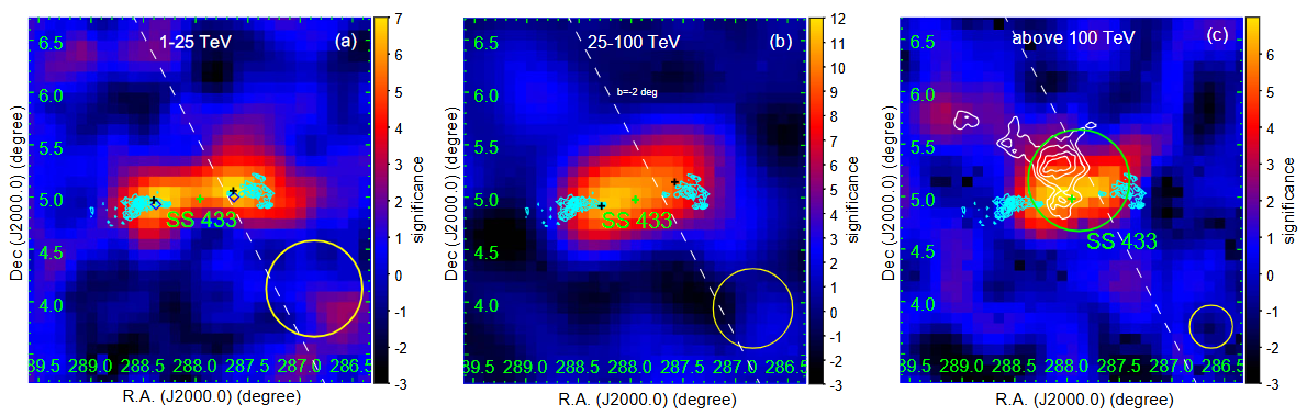图1拉索测量到的SS 433区域伽马射线显著性天图。左图:1-25TeV;中图:25-100TeV;右图:100TeV以上。图中青色十字代表黑洞的位置,青色的等高线为X射线瓣状结构,产生于黑洞双侧喷流与星际介质的相互作用。右图中白色等高线代表与SS 433相近距离上的原子云柱密度分布。