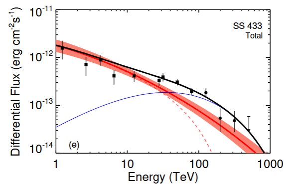 图2拉索测量到的SS 433区域伽马射线能谱(黑色数据点)。红色实线代表基于电子逆康普顿辐射模型对能谱数据的最佳拟合值,红色带状区域显示了最佳拟合的误差范围。红色虚线代表将最大电子加速能量降低至一个较合理的数值后的理论预期能谱。蓝色实线代表基于质子的强子辐射模型的理论预期能谱。黑色实线代表红色虚线与蓝色实线之和。