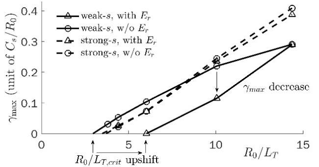 图.磁轴附近Er势阱仅在弱磁剪切下抬升ITG临界温度梯度