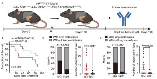 研究团队构建的与人类胰腺癌突变类似的胰腺癌基因工程小鼠模型,图为Spp1中和实验方案示意,经Spp1抗体或IgG对照处理的小鼠生存分析、肝肺转移发生率和数量统计