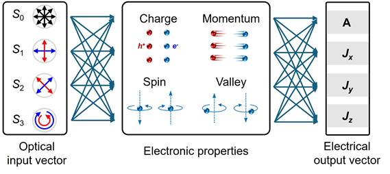 针对上述问题,作者创新性地提出了基于“信息映射”的统一物理框架(图2),将复杂的偏振光电转换过程归纳为两个关键步骤:首先,将光场的多维参数(光强、偏振角、偏振度和椭圆度)编码并映射到电子的多重自由度(电荷、动量、自旋和能谷);随后,这些被激发的电子态进一步转化为可直接测量的电学输出信号。