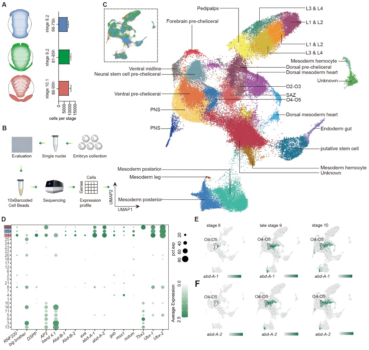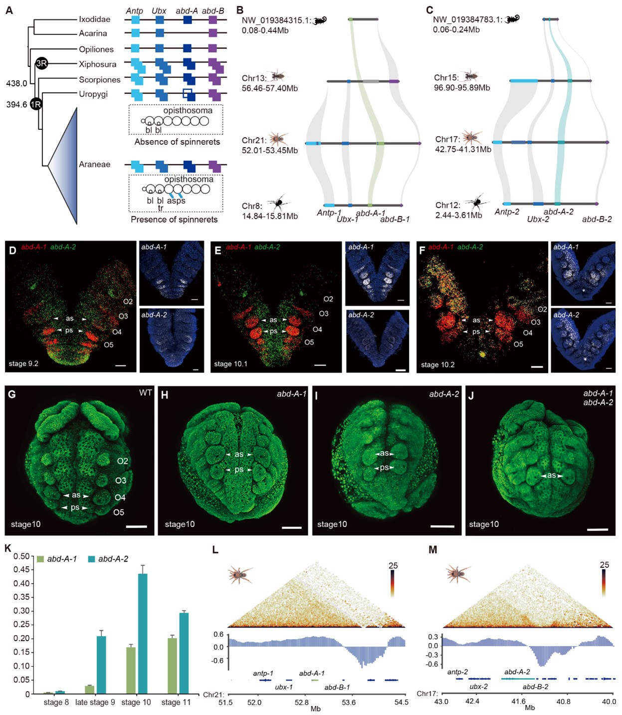 蜘蛛利用位于腹部的特殊结构——纺器,挤出并操控蛛丝。纺器的形成使得蜘蛛能够编织蛛网捕食猎物、借助蛛丝飞航扩散,从而成功演化出超过5万种物种。此前的研究曾推测,蜘蛛纺器的形成与沿前后轴分布的Hox基因以及沿近远轴分布的肢体模式基因相关,但缺乏实质性证据。