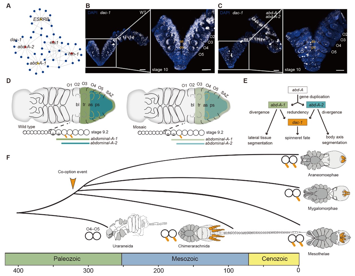 综合多组学数据和功能证据,本研究对纺器的遗传基础与演化路径进行了系统阐释。作者发现,abd-A的两个基因拷贝共同促进了第4和第5腹节上纺器的形成并招募了足模式基因dac-1参与纺器的精细构建。这不仅填补了节肢动物早期关键结构如何出现的知识空白,也支持了重复基因的网络在复杂形态创新中发挥核心作用的观点(图5)。