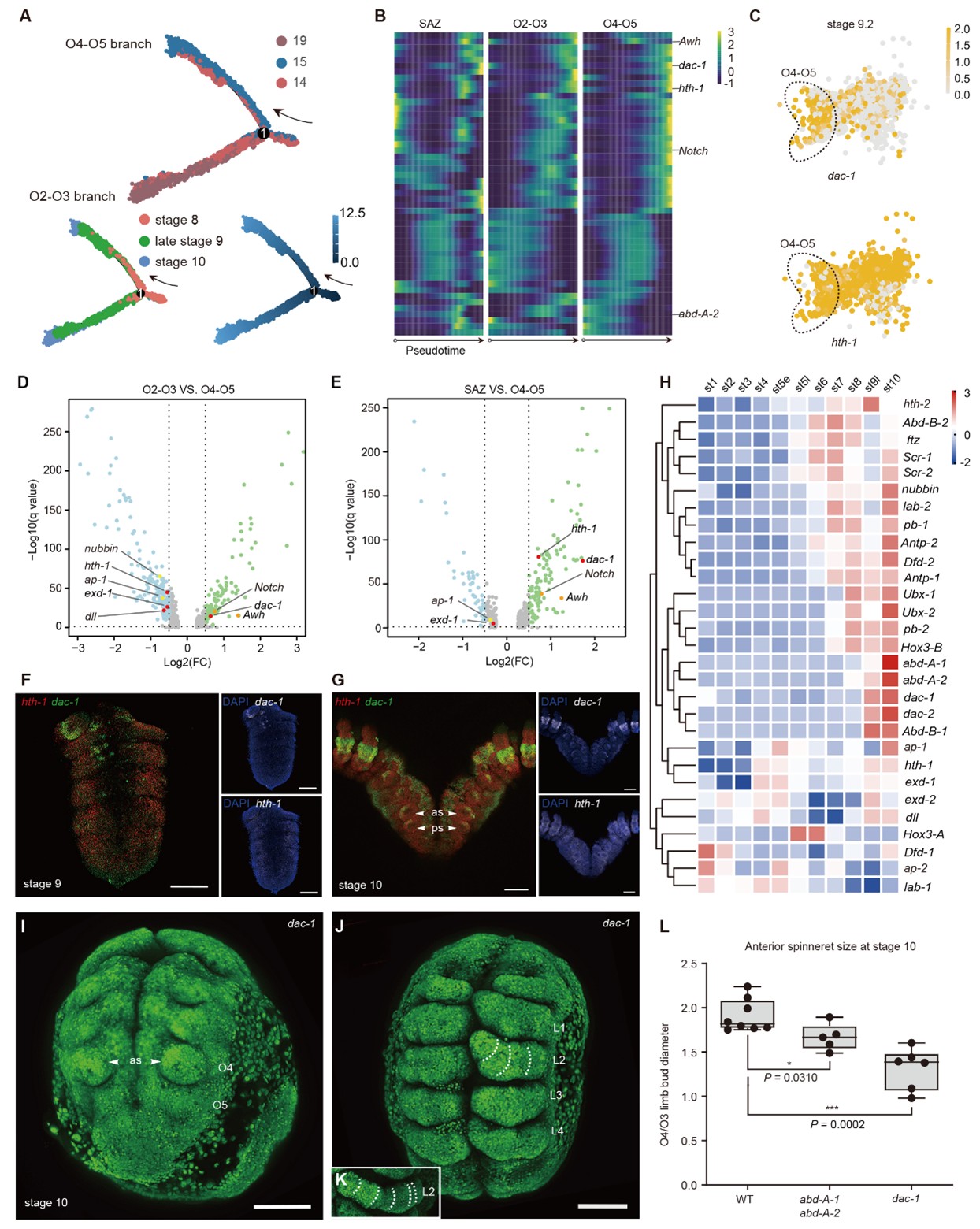 为了更深入地解析纺器形成过程中的基因调控模式,作者对蜘蛛胚胎在纺器出现前后的关键时期进行了单细胞测序。伪时序和差异表达分析识别出一批可能在纺器形成中发挥核心作用的候选基因,并为“纺器源自足”的假说提供了支持(图3)。进一步的基因表达分析与CRISPR/Cas9功能实验显示,dac-1的调控活动在腹部新区域被重新部署,这一结果强化了上述假设(图4)。