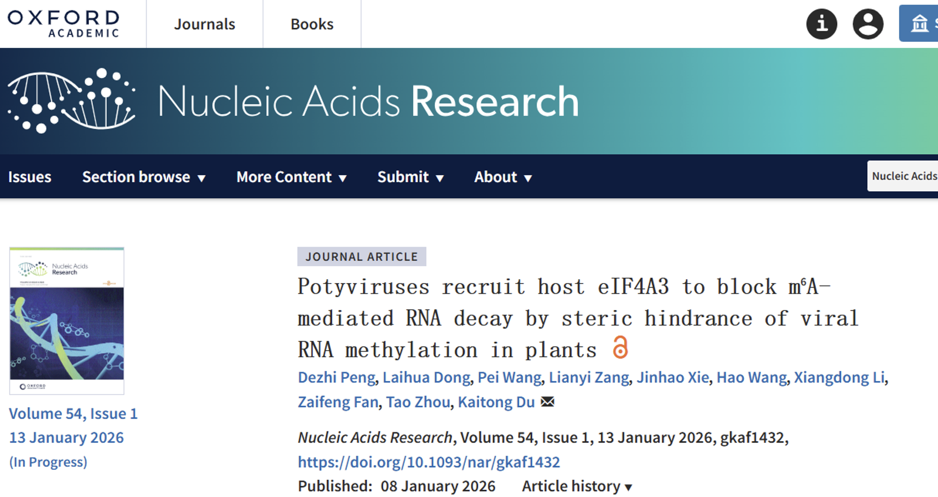 近日,植物保护学院周涛、杜开通团队在国际核酸研究知名期刊Nucleic Acids Research上发表研究论文Potyviruses recruit host eIF4A3 to block m6A-mediated RNA decay by steric hindrance of viral RNA methylation in plants。本文以“玉米矮花叶病”病害系统(SCMV—玉米)为研究对象,揭示了玉米RNA剪接因子ZmeIF4A3在调控m6A介导的RNA降解途径中的新功能,阐明了SCMV编码的多功能致病蛋白——NIa-Pro以互作依赖的方式把ZmeIF4A3招募至细胞质中的病毒RNA复制场所,阻碍病毒RNA的m6A甲基化修饰,进而抑制寄主m6A防御途径介导的病毒基因组RNA降解,从而促进SCMV复制和侵染的新机制。
