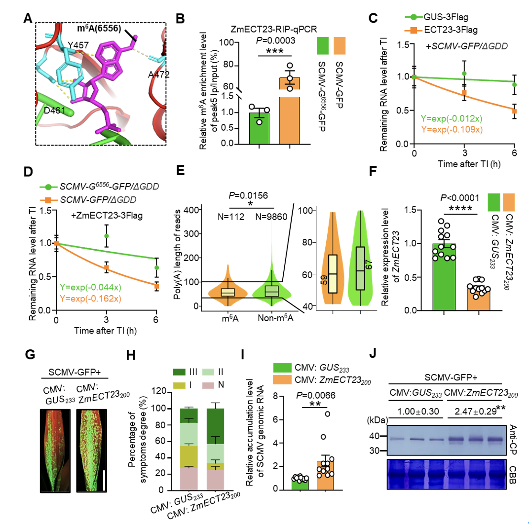 该研究通过Dot blot与MeRIP-seq分析发现SCMV基因组RNA发生m6A修饰。随后,结合直接RNA测序与SELECT技术鉴定到SCMV基因组RNA第6556位A发生m6A修饰。遗传学及病毒侵染实验显示,相对于野生型病毒,突变体病毒(突变A6556位点,只消除m6A修饰,不改变氨基酸序列)的复制和侵染能力均显著增强,且在玉米植株上造成更严重的花叶症状,表明该位点的m6A修饰不利于SCMV侵染致病(图1)。进一步,通过同源比对与结构预测分析,并结合分子生物学实验和功能基因沉默验证,鉴定并揭示了玉米m6A阅读蛋白ZmECT23能够特异性识别病毒RNA上的m6A修饰,并促进病毒RNA的降解,从而抑制SCMV的复制和侵染(图2)。