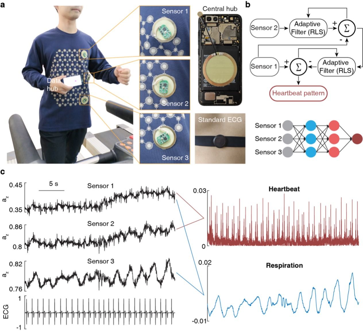 图2 运动状态下的高灵敏度生命体征监测。a, 集成三个加速度计的拓扑织物、传感单位、数据中枢以及用于对比的标准ECG信号。b, 用于提取纯净心跳和呼吸信号的两种算法。c, 静止状态下前30秒的原始传感数据(左)以及经处理后得到的心跳与呼吸模式(右)
