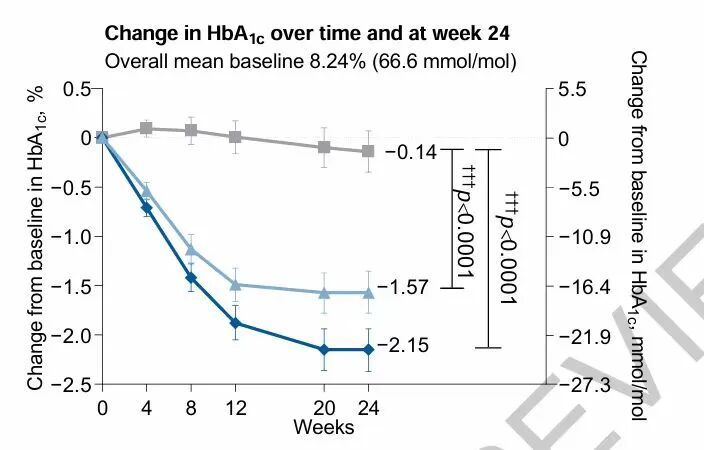 在第24周时,与安慰剂相比,玛仕度肽显著降低了糖化血红蛋白(主要终点):玛仕度肽4毫克组降低1.57%,6毫克组降低2.15%,而安慰剂组降低0.14%,治疗差异分别为-1.43%和-2.02%(两组p值均<0.0001)。体重在24周时也出现显著下降:4毫克组降低5.61%,6毫克组降低7.81%,安慰剂组降低1.26%(两组p值均<0.0001)。此外,与安慰剂组相比,玛仕度肽组有显著更多参与者达到具有临床意义的糖化血红蛋白目标(<7.0%)、减重目标(≥5%)以及复合终点(糖化血红蛋白<7.0%且体重减轻≥5%)。最常见的不良反应为腹泻、食欲减退和恶心,与GLP-1R激动剂类药物一致。