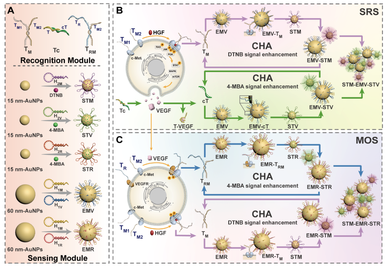 肝细胞生长因子/c-间充质-上皮转化因子(HGF/c-Met)信号通路的失调刺激侵袭性上皮间充质转化,并通过刺激血管内皮生长因子(VEGF)的分泌建立致病性反馈回路。目前上述受体二聚化检测方法在区分寡聚状态并将其与下游活性相关联方面存在局限性。针对这一问题,西安交通大学药学院王嗣岑、解笑瑜教授团队构建了一种催化DNA电路驱动的表面增强拉曼散射放大检测平台(CDCSA),实现了对药物-受体信号通路激活与反馈调节进行时空分辨的多路复用检测,并成功用于三种针对该通路不同节点抑制剂的药物靶点剖析。