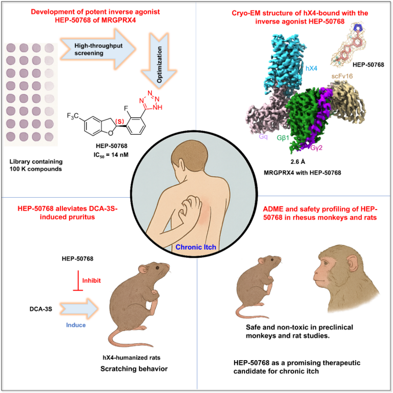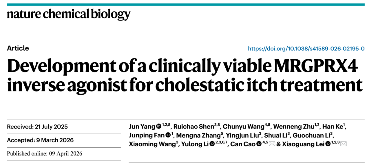 为进一步攻克靶向MRGPRX4的新药开发难题,雷晓光团队联合海湃泰克(北京)生物医药科技有限公司、中国科学技术大学曹灿团队于2026年4月9日在Nature Chemical Biology发表了题为“Development of a clinically viable MRGPRX4 inverse agonist for cholestatic itch treatment”的重要研究成果,成功开发出首个靶向MRGPRX4的小分子反向激动剂HEP-50768,为胆汁淤积瘙痒的精准治疗提供了全新方案。