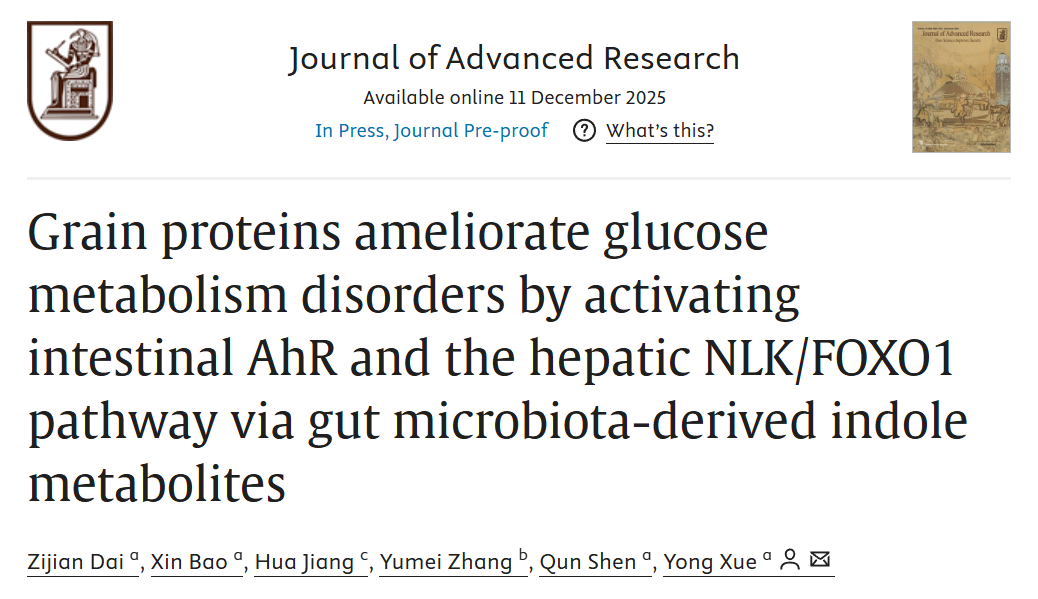 12月11日,Journal of Advanced Research杂志发表中国农业大学食品科学与营养工程学院沈群、薛勇团队最新研究成果Grain proteins ameliorate glucose metabolism disorders by activating intestinal AhR and the hepatic NLK/FOXO1 pathway via gut microbiota-derived indole metabolites。