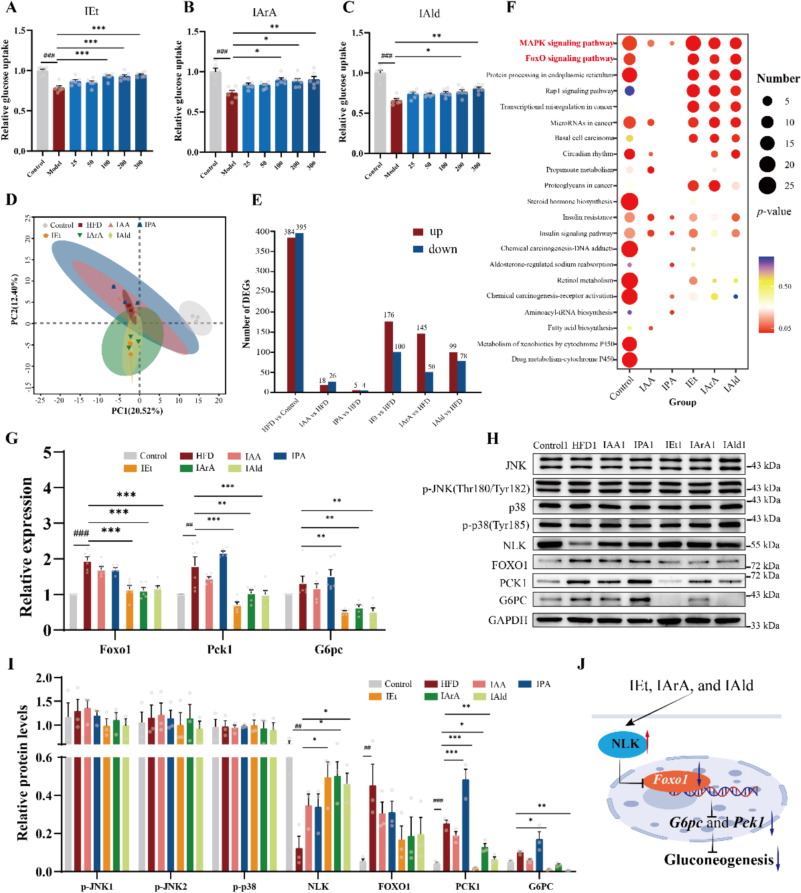 本研究发现,虽然不同谷物蛋白均可一定程度改善糖代谢紊乱,但青稞、燕麦和藜麦可显著改善糖代谢相关指标,而米和大豆没有明显效果,揭示了蛋白来源对其活性功能的重要影响。这些谷物蛋白干预可显著改变肠道菌群结构,促进色氨酸代谢菌的增殖,并诱导下游吲哚类代谢物的合成,这是蛋白实现糖代谢改善的关键路径。此外,本研究揭示特征性吲哚代谢衍生物通过激活AhR和调节肝脏糖异生NLK/FOXO1/PCK1/G6PC 信号轴的双重机制改善机体糖代谢紊乱。这为探索膳食营养,微生物和宿主互作调控代谢提供了新的研究发现。