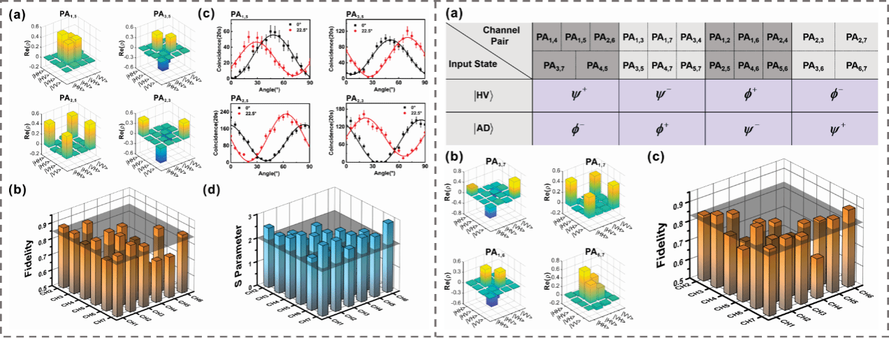 图3. HV光子对入射到超构表面,在21个通道组合中产生并分发四种贝尔态(左图);AD光子对入射到超构表面,在21个通道组合中产生并分发四种贝尔态(右图)。