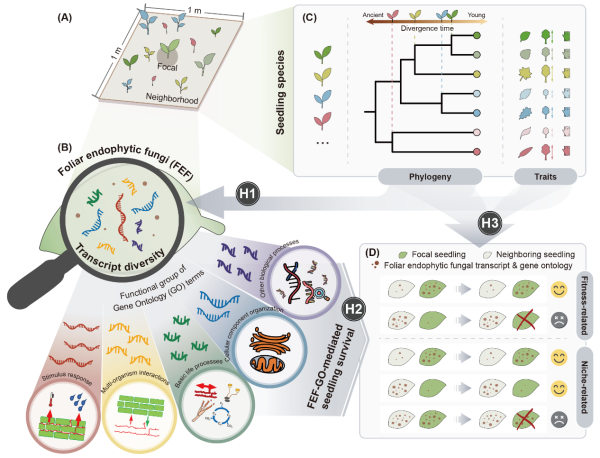 针对上述科学问题,中国科学院植物研究所整合了古田山亚热带森林103种木本植物幼苗的转录组数据、物种水平的功能性状以及长期幼苗动态监测数据,通过提取叶片内生真菌转录本并结合基因本体(GO)功能注释解析其分子功能,揭示了叶片内生真菌调控森林幼苗存活与物种共存的关键分子机制。