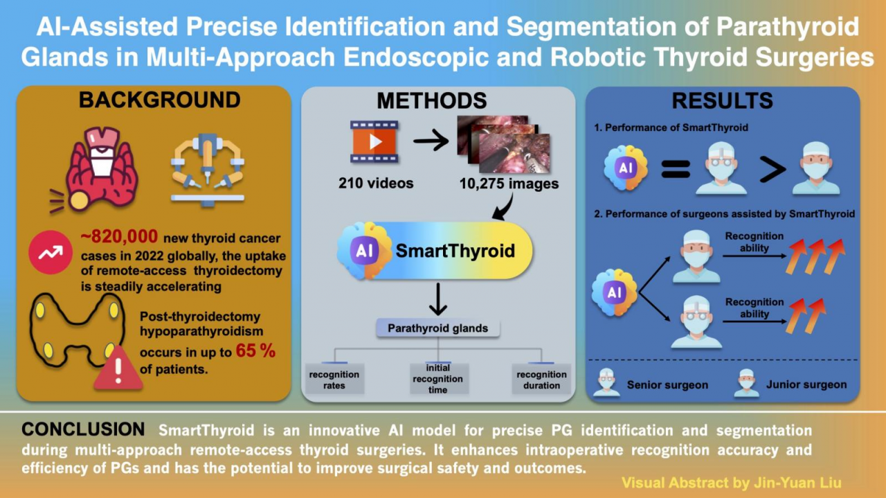 该论文所涉研究由电子科技大学耳鼻咽喉头颈外科硕士研究生刘瑾源在李超教授和孙荣昊教授的指导下开展。该研究以头颈外科近年来最新的进展腔镜(机器人)手术的人工智能辅助方式为目标,基于多入路腔镜及机器人甲状腺手术数据,研发了腔镜(机器人)手术中甲状旁腺的智能识别系统“SmartThyroid”,实现了手术中甲状旁腺的实时精准识别与自动分割,并进行了综合的临床评估,证实其灵敏度特异度等指标均表现优异,在人工智能辅助术中导航领域取得了突破性进展。有效提高了手术安全性,同时有力减少相关并发症的发生,提高患者术后的生活质量。