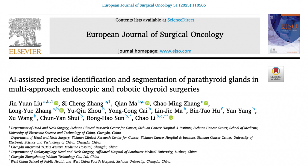 近日,电子科技大学医学院李超教授团队在AI辅助精准医疗研究领域取得新进展,以“AI-Assisted Precise Identification and Segmentation of Parathyroid Glands in Multi-Approach Endoscopic and Robotic Thyroid Surgeries”为题在欧洲外科肿瘤学杂志(EJSO)上发表论文。论文通讯作者为李超教授,论文共同第一作者为电子科技大学2023级专硕研究生刘瑾源。