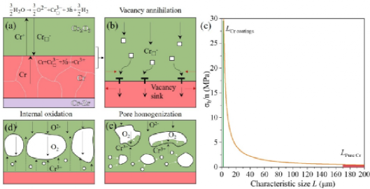 图3 蒸气环境下Cr2O3孔洞形成机制。(a) 阳离子空位聚集,(b)-(c) 高背应力的Cr涂层导致Cr/Cr2O3界面处空位湮灭效率降低引发孔洞形成,(d) 孔洞阻止金属阳离子向上扩散,(e) 孔洞均匀化过程。