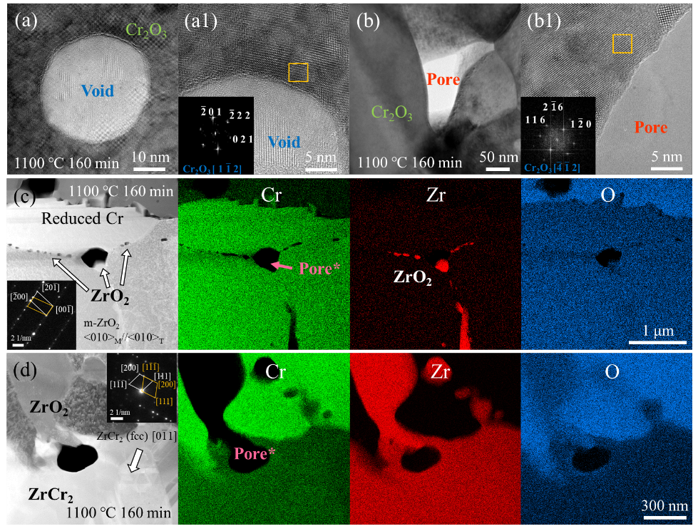 图2 在1100 ℃水蒸气中氧化160 min后Cr2O3及Cr涂层中孔洞结构特点: (a),(a1),(b),(b1) 纳米级和微米级孔洞结构,(c) Cr2O3-Zr氧化还原反应引发Cr涂层晶界处形成孔洞,(d) 柯肯达尔效应导致Cr涂层/Cr-Zr扩散层界面形成孔洞