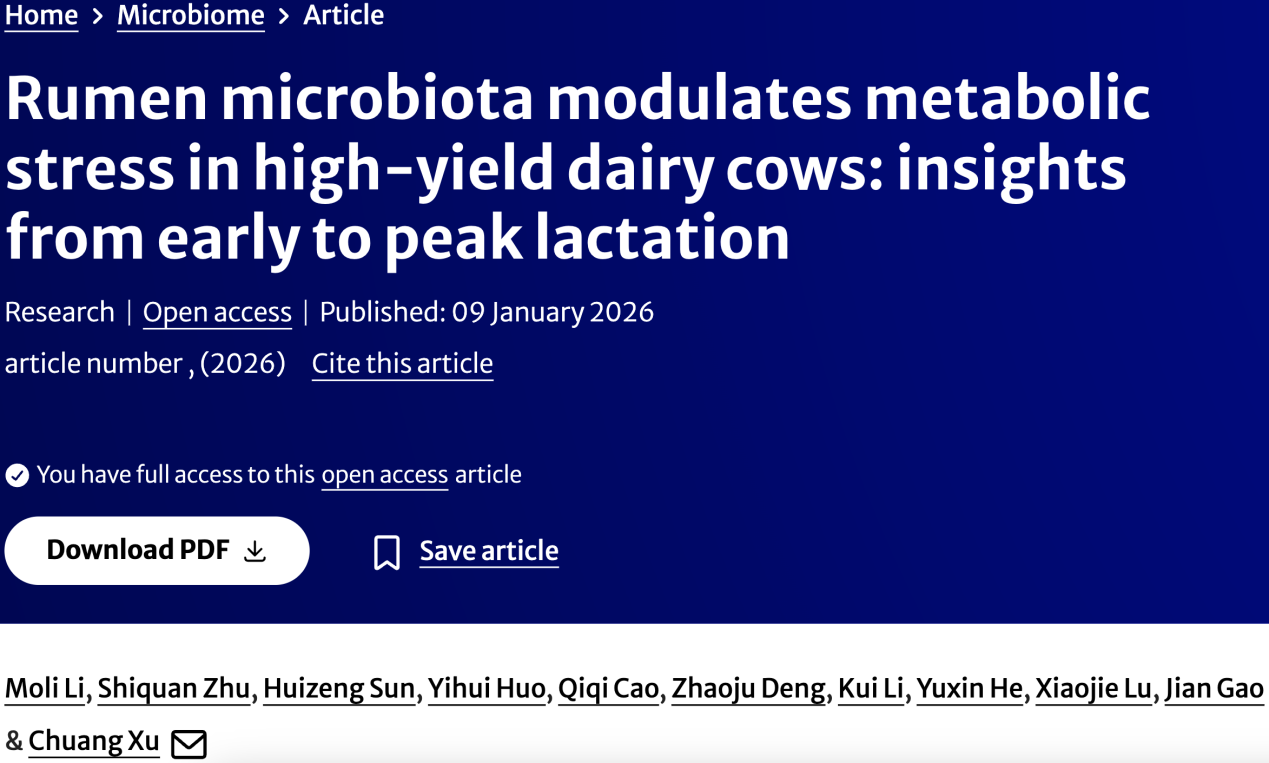 近日,中国农业大学动物医学院、兽医公共卫生安全全国重点实验室徐闯教授团队在国际微生物组学领域期刊《微生物组》(Microbiome)发表研究论文《瘤胃菌群色氨酸代谢转换调控奶牛代谢应激》(Rumen microbiota modulates metabolic stress in high-yield dairy cows: insights from early to peak lactation)。该研究采用纵向多组学方法,揭示了高产奶牛从泌乳早期到高峰期过程中瘤胃微生态结构、功能及其代谢产物动态变化对机体代谢应激的调控作用,阐明了色氨酸代谢通路重塑,尤其是吲哚-3-乙酸生成增强在缓解氧化应激和炎症反应中的关键作用,为高产奶牛围产期代谢健康精准调控提供了新的理论基础和潜在干预方向。