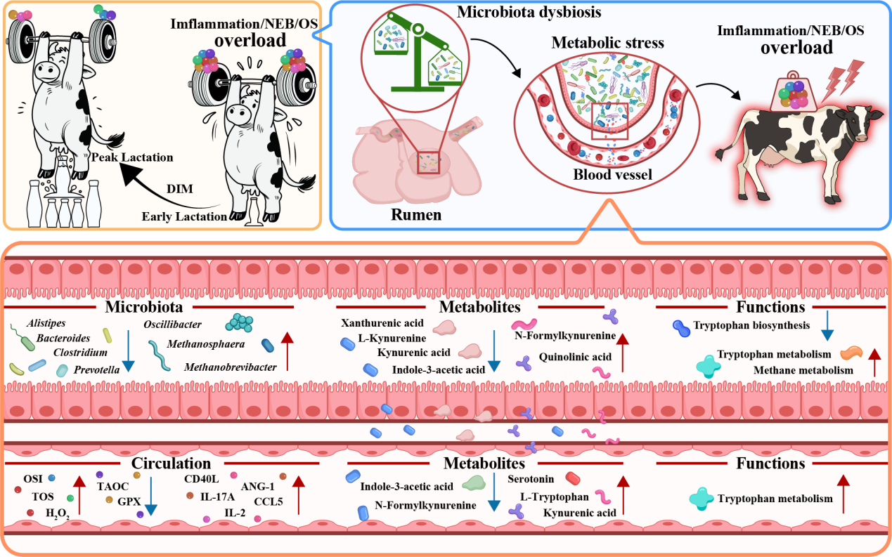 泌乳早期是高产奶牛代谢稳态紊乱的关键阶段,氧化应激、炎症反应和脂肪过度动员等现象普遍存在,是引起代谢应激发生的重要病理基础。本研究以高产泌乳奶牛为对象,围绕“瘤胃微生物-代谢物-宿主代谢应激”这一调控轴,开展覆盖泌乳早期至高峰期的纵向研究。通过整合瘤胃宏基因组、瘤胃与血清代谢组及炎症因子谱等多组学数据,揭示了奶牛代谢应激随泌乳进程的动态变化特征。