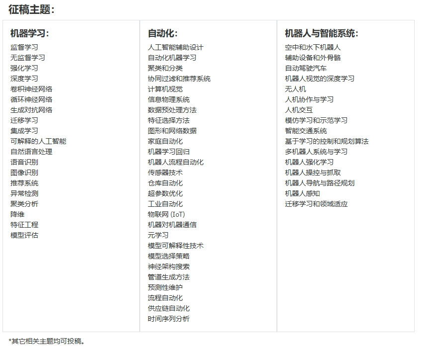 我们诚邀各界专家学者积极投稿,参与本次盛会,共同探讨机器学习、自动化、机器人与智能系统等领域的最新研究。请注意,会议最终投稿截止日期为2025年8月27日。