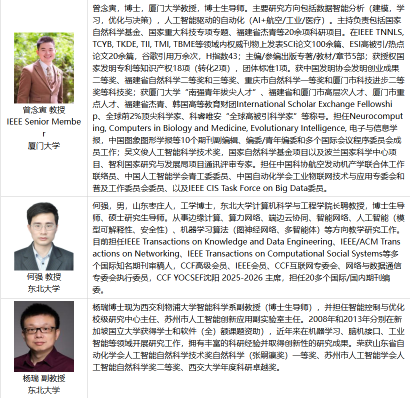 进化算法 群体智能 机器学习 强化学习 进化优化算法的理论与应用 群智能与协同优化 强化学习在优化问题中的应用 智能启发式与元启发式算法设计 优化算法的可解释性与鲁棒性研究 |