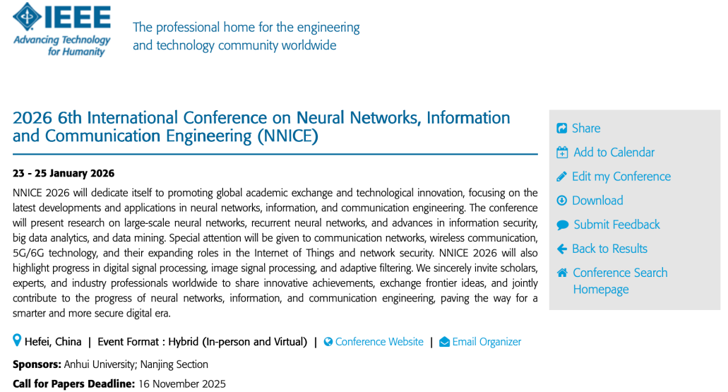 录用文章将跟随主会NNICE 2026提交IEEE出版,NNICE已连续5届成功被 EI & Scopus 检索,往届快至会后3个月完成见刊,见刊后1个月完成检索。