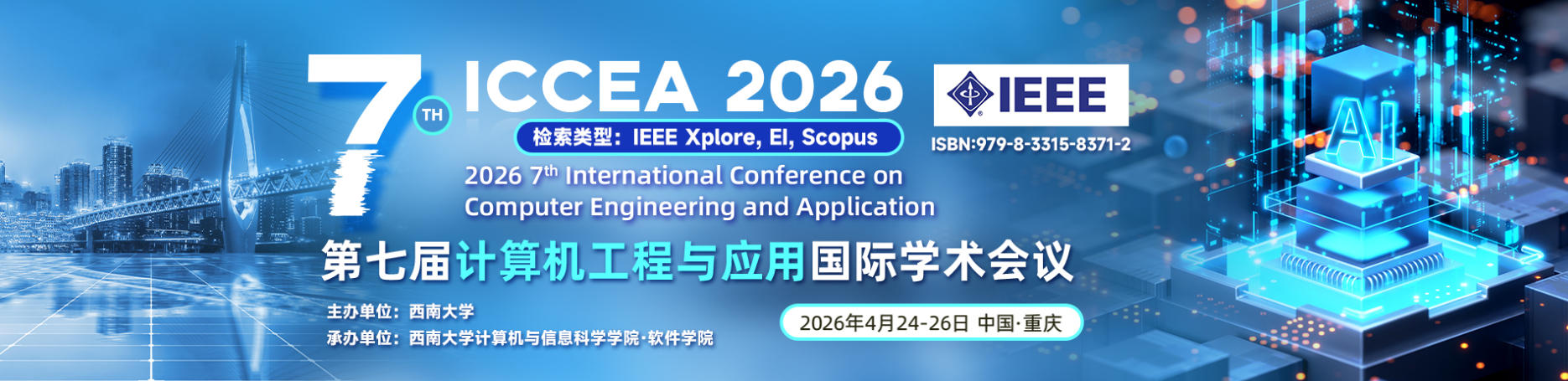 第七届计算机工程与应用国际学术会议(ICCEA 2026)将于2026年4月24-26日在重庆召开会议。ICCEA 2026致力于汇聚全球计算机科学与工程领域的学者、研究人员和产业专家,围绕前沿技术与创新应用展开深入交流与探讨。本次会议主题涵盖人工智能、大数据分析、云计算、物联网、边缘计算及其在智能制造、智慧城市、网络安全等领域的交叉应用。大会旨在推动理论研究与工程应用的有机结合,促进多学科协同创新,分享最新科研成果与技术进展,搭建产学研合作平台,助力信息技术的可持续发展与数字经济转型升级。该会议为国内外的专家学者提供一个交流研究成果、分享最新科技信息、探讨未来发展趋势的平台,以期推动该领域理论、技术在高校和企业的发展和应用,诚邀您到场参加,共同交流。