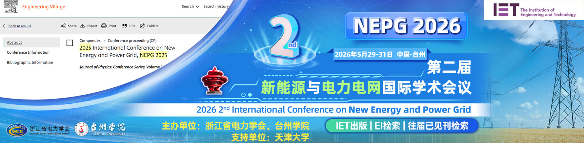 由浙江省电力学会和台州学院主办的第二届新能源与电力电网国际学术会议(NEPG 2026)将于2026年5月29日至31日在中国台州举行。主要围绕“储能技术”、“能源应用”、“智能电网”、“发电技术”等研究领域展开讨论。旨在为新能源与电力电网的专家学者及企业发展提供一个分享研究成果、讨论存在的问题与挑战、探索前沿科技的国际性合作交流平台。欢迎国内外学者踊跃投稿和参与。