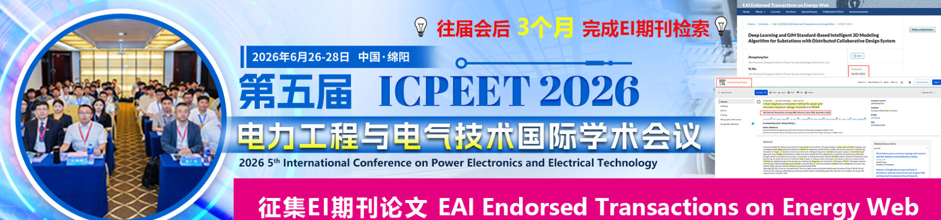 第五届电力工程与电气技术国际学术会议(ICPEET 2026)将于2026年6月26-28日在中国绵阳市举行。会议主要围绕“电力工程”与“电气技术”等研究领域展开讨论,旨在为“电力工程”与“电气技术”方面的专家学者、技术研发人员及企业发展人士提供一个共享科研成果和前沿技术,了解学术发展趋势,拓宽研究思路,加强学术研究和探讨,促进学术成果产业化合作的平台。大会诚邀国内外高校、科研机构专家、学者,企业界人士及其他相关人员参会交流。