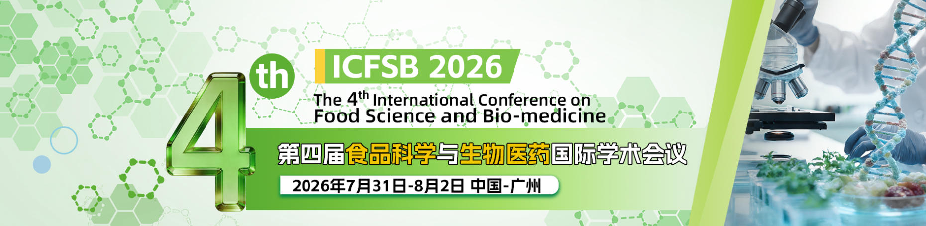 第四届食品科学与生物医药国际学术会议(ICFSB 2026) 于2026年7月31日-8月2日在中国广州召开。本次会议主题覆盖生物工程、生物医学、微生物学、分子生物学、生物化学、食品科学、农业技术、食品安全与质量等。本次会议旨在加强世界各国的生物技术和食品科学交流,为国内外从事生物技术和食品科学研究的专家、学者、科技工作者、企业家及其他相关人员提供高水准的交流新思想和展示研究成果的有利平台,共同促进国际生物技术和食品科学领域的不断发展与创新,推动全球合作伙伴之间建立商业或科研合作。