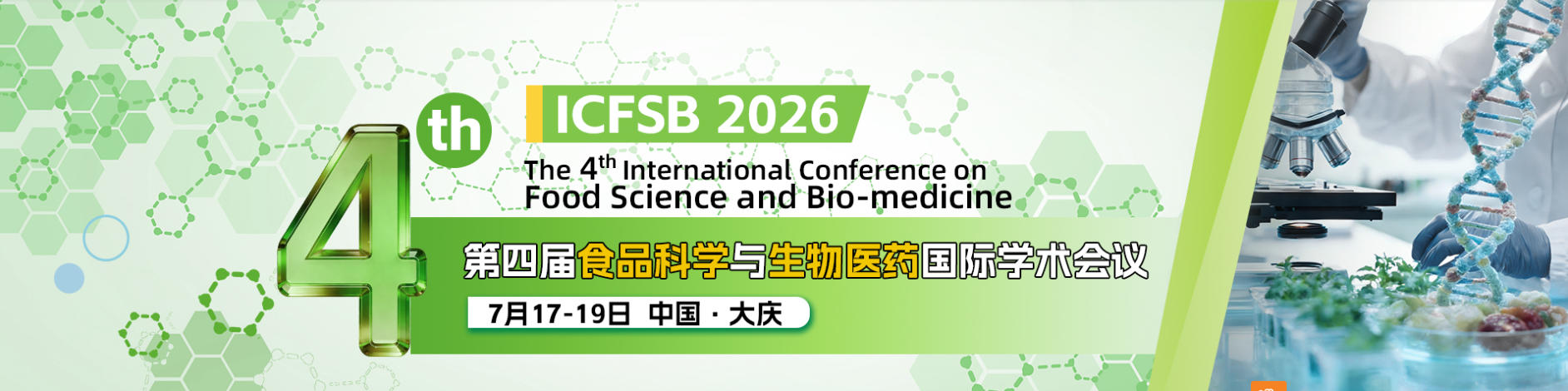 第四届食品科学与生物医药国际学术会议(ICFSB 2026) 于2026年7月17-19日在中国大庆召开。本次会议主题覆盖生物工程、生物医学、微生物学、分子生物学、生物化学、食品科学、农业技术、食品安全与质量等。本次会议旨在加强世界各国的生物技术和食品科学交流,为国内外从事生物技术和食品科学研究的专家、学者、科技工作者、企业家及其他相关人员提供高水准的交流新思想和展示研究成果的有利平台,共同促进国际生物技术和食品科学领域的不断发展与创新,推动全球合作伙伴之间建立商业或科研合作。