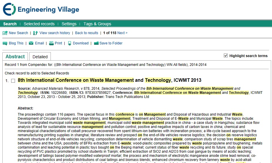 《第八届固体废物管理与技术国际会议论文集》已由Trans Tech Publications(以下简写为“TTP”)出版社出版,并已完成EI(Engineering Index)检索,检索号20140817358993。